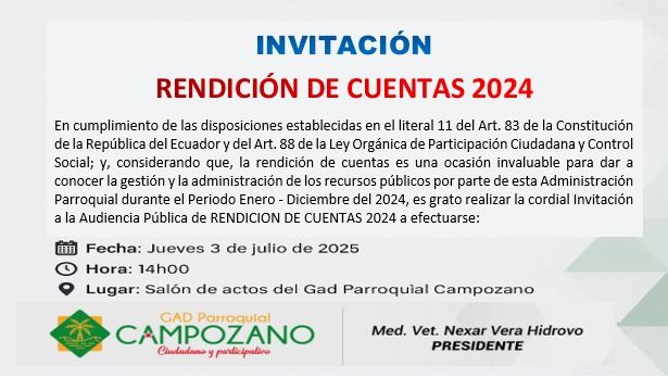 El GAD GAD CAMPOZANO, dando cumplimiento al Código Orgánico de Organización Territorial, Autonomía y Descentralización (COOTAD), que en su Art. 234.- dice: El Plan Operativo Anual (POA), deberá contener una descripción de la magnitud e importancia de la necesidad pública que satisface, la especificación de sus objetivos y metas, la indicación de los recursos necesarios para su cumplimiento. A fin de hacer posible su evaluación técnica, las dependencias de los gobiernos autónomos descentralizados deberán presentar programas y proyectos alineados al Plan de Desarrollo y Ordenamiento Territorial.